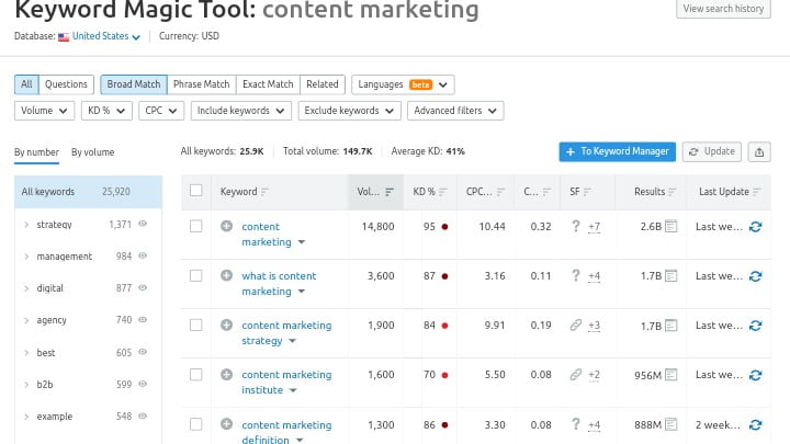 Filter through the Semrush Keyword Magic Tool results by volume, question, related keywords, and other metrics depending on your goal.