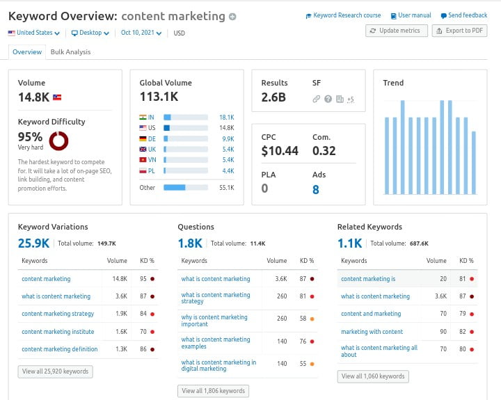 For keyword analysis, I recommend you to use Semrush’s Keyword Magic and Keyword Overview tools. These tools offer comprehensive insights such as keyword difficult, related keywords, questions and other valuable keyword metrics.