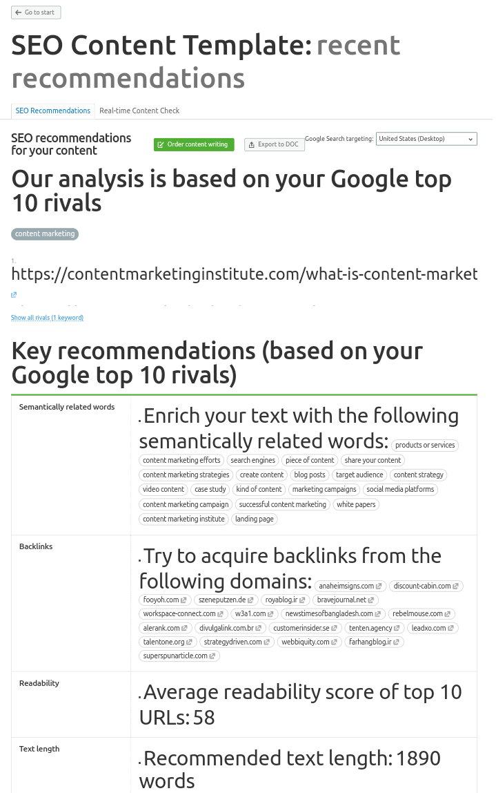 The generated template, groups the recommendations into back-links to aquire, text length, semantically related keywords to include and more.